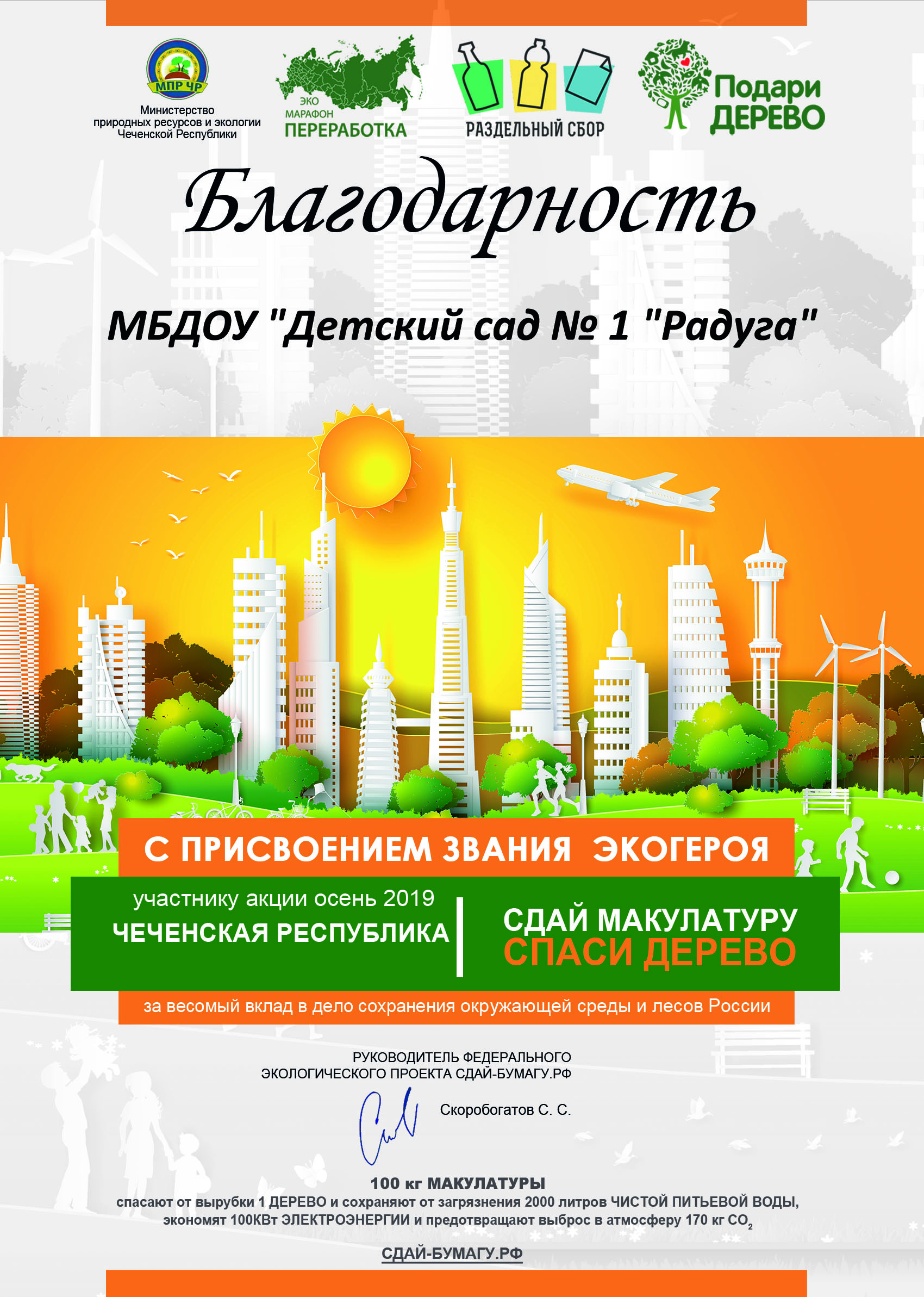 16.12.2019Наш колектив получил благодарственное письмо, за активное участие в экологической акции "Сдай макулатуру-спаси дерево" в рамках Всероссийского эко-марафона "Переработка"