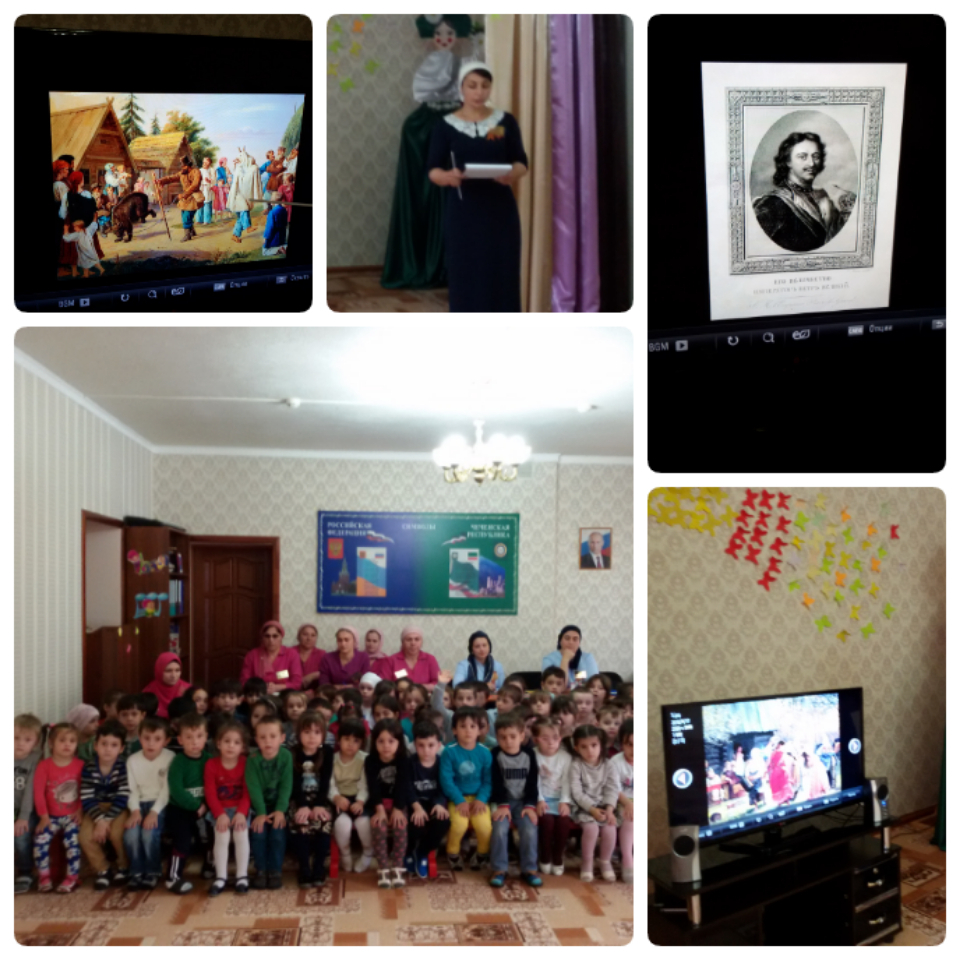 Оборудование: портреты В.В. Путина, Р.А. Кадырова, телевизор, DVD, презентации «1 мая – День Весны и Труда», "Чикаго" , шары, цветы, плакат с глобусом, голуби, ладошки.