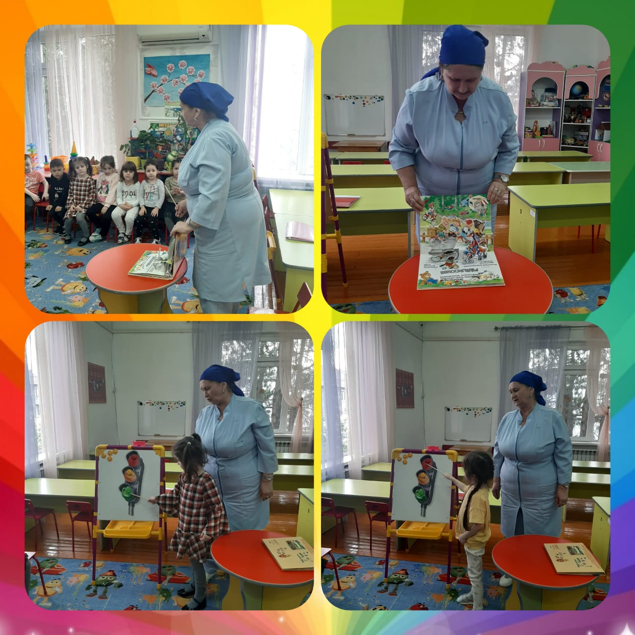 Цель: Закреплять знания детей о правилах дорожного движения. Довести до сознания детей, к чему может привести нарушение правил дорожного движения. Расширять знания детей об улице, о правилах поведения детей на улице, о транспорте. Уточнить знания о работе светофора, о назначении его сигналов.