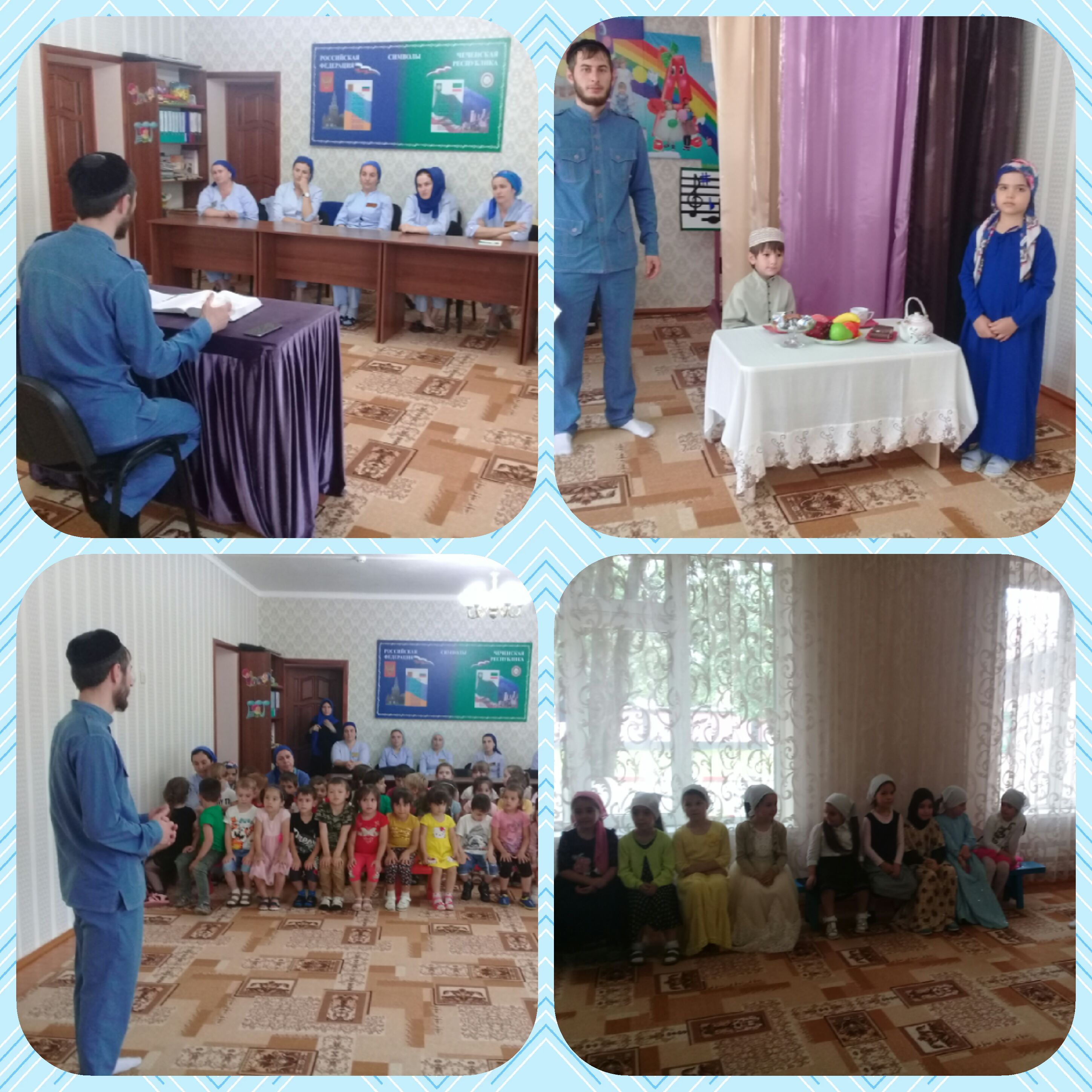 Педагогом дополнительного образования Ю.В. Найбаровым были проведены тематические беседы в средних и старших группах на тему: «Марха кхобучо хун да мегар дац». Также, 23.06.2017г. педагогом дополнительного образования Ю.В. Найбаровым, совместно с воспитателями старшей группы «А» М.Х. Алисултановой и М.А. Есеевой было проведено праздничное мероприятие «Марха досту де», посвященное празднованию окончания священного месяца Рамадан, с участием воспитанников старшей группы «А». В ходе праздника, воспитанники прочитали стихотворения на родном языке, в которых говорилось о ценности и значимости праздника, также, воспитанники старшей группы «А» показали сценку «Марха досту де», в которой показывались все традиции проведения мусульманского праздника. В конце мероприятия, педагог дополнительного образования Ю.В. Найбаров и воспитатели старшей группы «А» поздравили всех с окончанием священного поста месяца Рамадан.