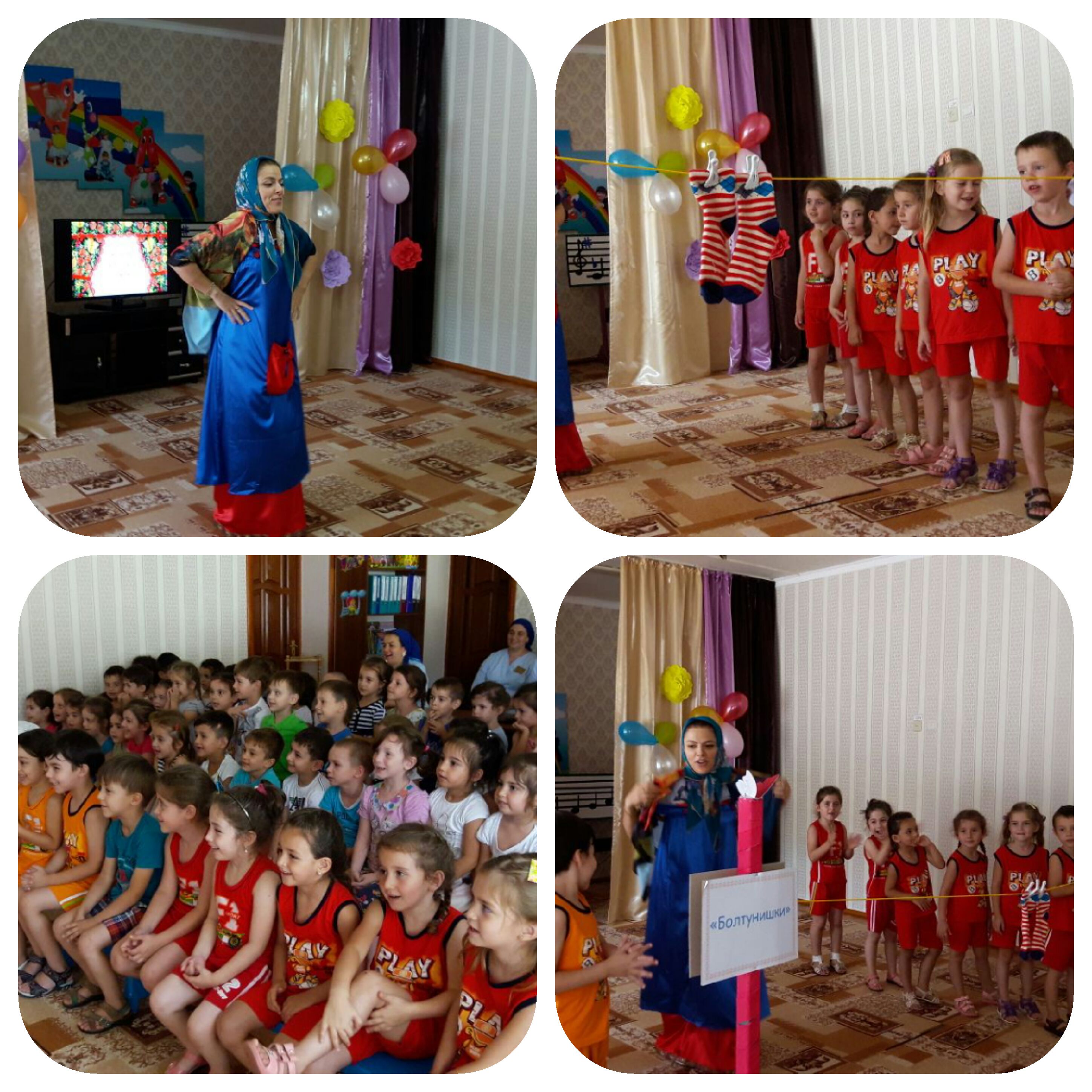 Смотр - конкурс начался с того, как в гости к детям пришел сюрпризный момент – бабушка Аграфена Дормидонтовна, с деревни Проговорушкино, роль которой исполняла ответсвенная за проведение конкурса – учитель – логопед И.А. Шудуева. Она поприветствовала детей, спела им частушки, и рассказала, откуда появились поговорки и скороговорки в быту у людей. Далее, Аграфена Дормидонтовна предложила детям разделиться на команды – «Болтунишки» и «Говорунишки», каждой команде выбрать своего капитана команды, придумать девиз и посоревноваться на лучшее знание и правильное произношение поговорок и скороговорок. А оценить качество проводимых заданий, Аграфена Дормитонтовна любезно предложила жюри конкурса в лице заведующего ДОУ З.А. Сайдулаевой и старшего воспитателя М.М. Висимбаевой. Все задания от Агафены Дормитонтовны детям понравились и успешно с ними справились. В особенности дети хорошо проявили себя в конкурсе «Домашнее задание». Воспитанники обеих старших групп рассказали большое количество поговорок и скороговорок про дружбу. «Но, как и в любом конкурсе, у нас тоже должны быть победители, поэтому я бы хотела уточнить у членов жюри, за какой командой будет победа?» - подчеркнула в конце конкурса Аграфена Дормитонтовна. По итогам всех проведенных конкурсных заданий между двумя командами победа осталась за командой «Говорунишки». Члены жюри и Аграфена Дормидонтовна поблагодарили детей за хорошие знания поговорок и скороговорок, поздравили всех участников конкурса. Участники были награждены почетными грамотами и памятными подарками.